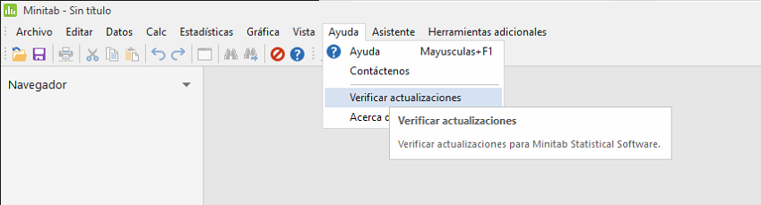 - Si cuando iniciamos Minitab 20 de forma local en nuestro equipo no se nos informa de la disponibilidad de una nueva revisión, podemos forzar la actualización de la instalación a través del comando Verificar actualizaciones bajo el menú Ayuda: