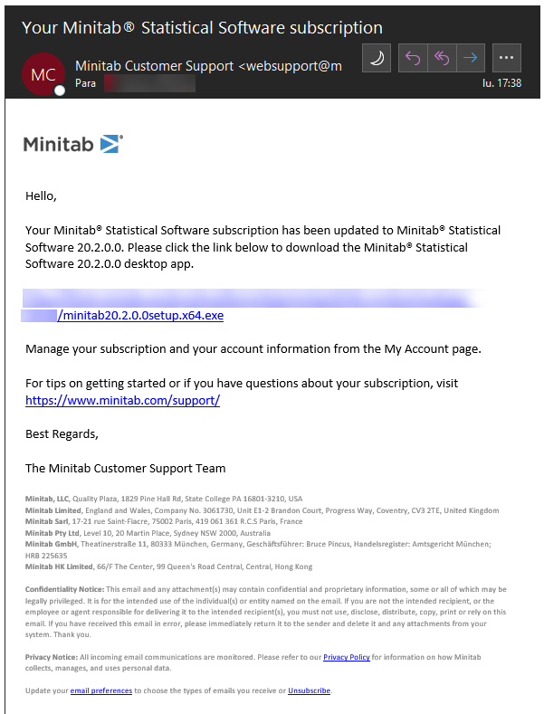 - A continuación podemos observar el aviso de disponibilidad de la versión 20.2.0.0. Se nos recomienda comprobar los requisitos de sistema operativo antes de llevar a cabo la instalación y se nos facilita un enlace para descargar el instalador y otro para migrar la suscripción a Minitab 20.2.0.0: