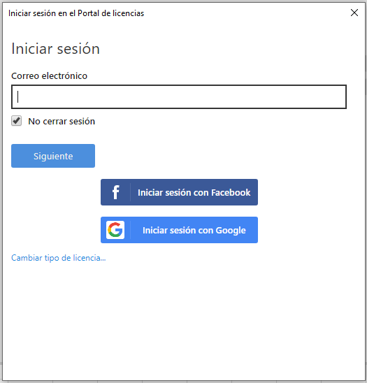 Podemos iniciar sesión con las credenciales del portal de licencias o con una cuenta de Facebook o de Google