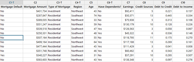 A continuación se muestra una sección de los datos de observación utilizados en el análisis. Hay 1.645 observaciones sobre hipotecas de clientes anteriores. La columna C1 muestra la variable de respuesta, u objetivo, que contiene "Yes" si esa persona incumplió con su hipoteca o "No" si no lo hizo. Las otras 9 columnas contienen las características que evaluaremos como predictores potenciales.