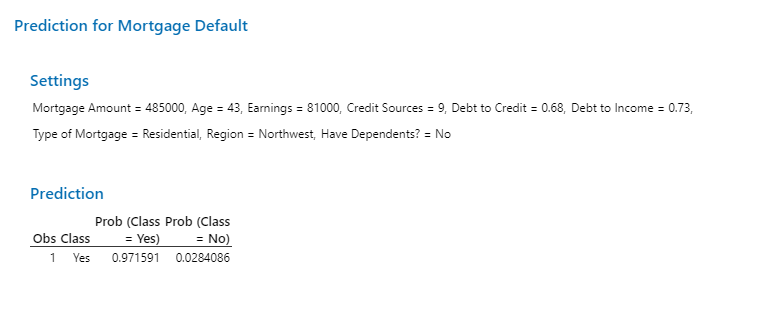 Introducimos estos valores en el modelo predictivo para obtener una probabilidad de que el individuo incumpla, tal y como se muestra en el resultado de la predicción más abajo. La probabilidad de que este individuo incumpla su hipoteca es superior al 97%. Una vez que se hacen las predicciones, usted, el que tiene el conocimiento de la industria, puede interpretar la predicción y actuar en consecuencia. Supongo que es probable que una persona con una probabilidad de incumplimiento del 97% sea rechazada para una hipoteca.