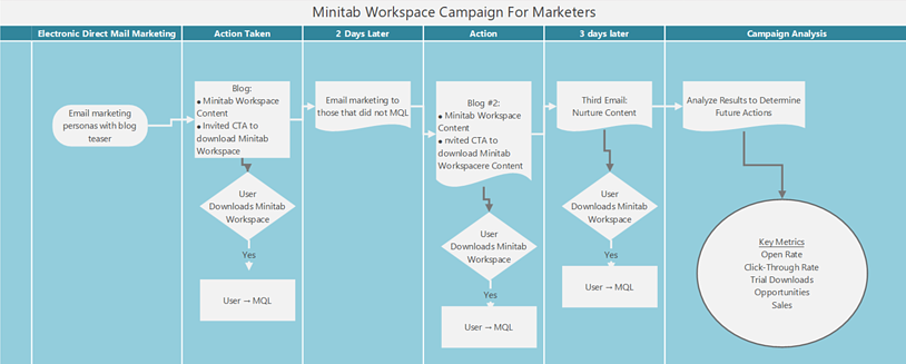 Minitab Workspace está diseñado para albergar mapeos de procesos complejos, por lo que utilizarlo es tan fácil como apuntar, hacer clic y construir. De hecho, utilizamos Minitab Workspace para crear un proceso que incorpora este blog como parte de una campaña de concienciación del producto. Prueba de que funciona: estás leyendo esto ¿verdad? 😊