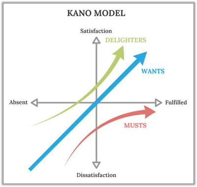 Según el Modelo de Kano, las características de los productos o servicios pueden agruparse en categorías, lo que puede ser increiblemente valioso para que los especialistas en marketing consideren que equipos querrán crear y desarrollar: