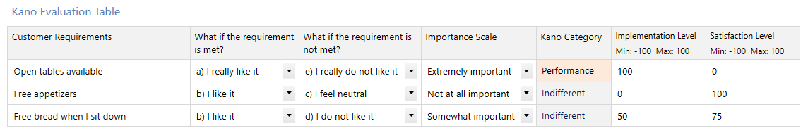Imagine que es parte de un equipo de marketing de un restaurante y está tratando de entender cómo diferenciar el restaurante de sus competidores cercanos. Para lograr esto, el equipo realiza una encuesta a los clientes preguntando sobre algunas ideas de formas de aumentar su satisfacción con las experiencias gastronómicas en el restaurante. Las preguntas se centran en la importancia de la disponibilidad de asientos, el interés del pan gratis fácilmente disponible y si ofrecer aperitivos gratis sería una nueva característica atractiva.