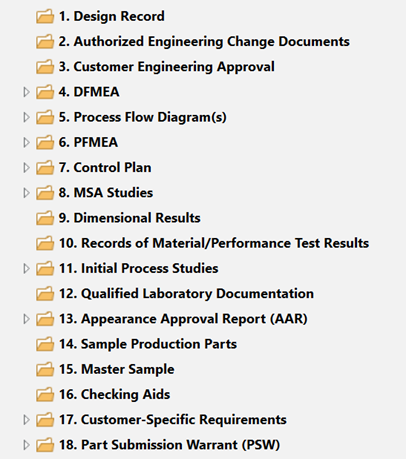 PPAP se compone de una colección de documentos que deben recopilarse y compilarse al proporcionar una pieza para un cliente. Según la AIAG hay 18 elementos en un PPAP. Estos se componen de diferentes documentos, algunos de los cuales deben enviarse a los clientes, y otros deben tenerse a mano para enviarlos si es necesario.