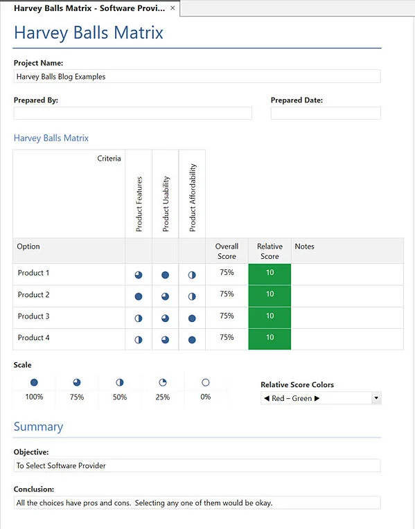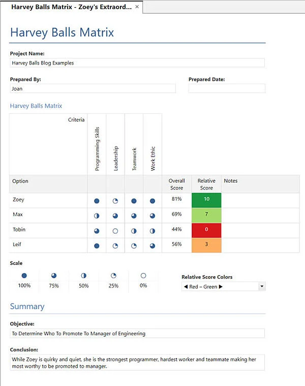 Como se puede ver, Joan evaluó a su equipo de programación utilizando diferentes características. Harvey Ball Matrix ayudó a Joan a determinar quién debería ascender al calcular automáticamente un puntaje basado en su evaluación. Si bien todos pensaron que Leif y Zoey estaban bastante cerca porque ambos son los programadores más fuertes, Harvey Ball Matrix deja claro que la decisión de promover a Zoey fue fácil.