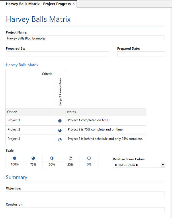 Un uso simple, rápido y común de la matriz de bolas Harvey es transmitir el estado del proyecto. En el siguiente ejemplo, usamos el formulario Harvey Balls para indicar el estado de tres proyectos. En menos de un minuto, se puede crear un formulario y demostrar el progreso y una descripción general de todos los proyectos.
