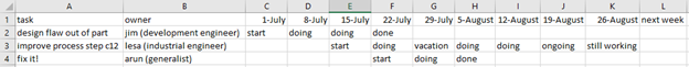 - Al crecer como un ingeniero siempre hacemos el seguimiento de nuestros proyectos en hojas de Excel o Google. El seguimiento del proyecto se actualiza regularmente con información de quién está haceiendo qué y cuándo. No siempre usamos un diagrama de Gantt, es más un registro de la actividad.