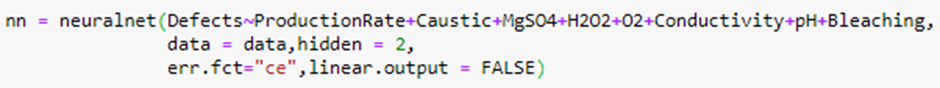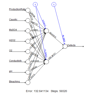 La capa de entrada de la izquierda (primera fila de nodos) recibe información de cada una de las ocho variables de entrada. Encima de cada línea están los pesos sinápticos, que influyen en la siguiente capa de la red. Hay una capa oculta formada por dos neuronas y los círculos azules representan el sesgo, que corresponde a la intersección en un modelo de regresión estándar, ¡es la capa oculta donde ocurre la magia! La neurona de salida del lado derecho representa la variable Defects.