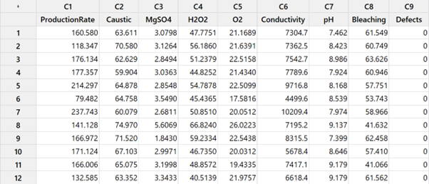 La idea es utilizar los datos en las columnas C1 a C8 para comprender si un lote fallará o no (las columnas Defects igual a 1). Ella utilizará los modelos disponibles en Minitab.