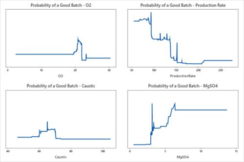 Luego, usa la salida de TreeNet para comprender qué parámetros son los más influyentes para causar un lote defectuoso. Uno de los beneficios de los modelos de Minitab es que brindan mucha información complementaria (como los gráficos a continuación) como estándar, facilitando su comprensión de lo que significa el modelo.