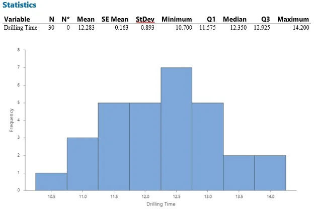 Como ejemplo, imagínese que una compañía petrolera quiere evaluar y mejorar su proceso de perforación en términos de velocidad de perforación, específicamente el tiempo que lleva perforar a cierta profundidad. El objetivo de la empresa es perforar hasta cierta profundidad en 12 horas. La empresa ha recopilado datos sobre tiempos de perforación para una muestra de pozos perforados en un campo en particular.