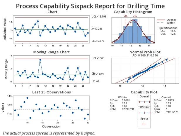 Al utilizar el Análisis de capacidad seis en uno propiedad de Minitab, con un rápido clic del mouse se pueden ver gráficos de control que resaltan que el proceso es estable. Desafortunadamente, tanto nuestro Cpk como nuestro Ppk están cerca de cero, lo que destaca que nuestro proceso no es capaz. Para que un proceso sea capaz, su Cpk y Ppk deben ser al menos superiores a 1,33, idealmente un valor de 2,0 o superior cuando sea posible.