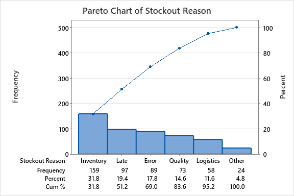 Un gráfico de Pareto es un tipo especial de gráfico de barras en el que los valores trazados se organizan de mayor a menor. Los diagramas de Pareto se utilizan para identificar y priorizar los factores o problemas más importantes que afectan un resultado en particular. Aplicado a la gestión de inventario, implica que una parte importante de los problemas y costes se pueden rastrear hasta unos pocos artículos o categorías críticas. Al centrar los esfuerzos en estos "pocos vitales", los gerentes de la cadena de suministro pueden maximizar su impacto en la optimización del inventario.