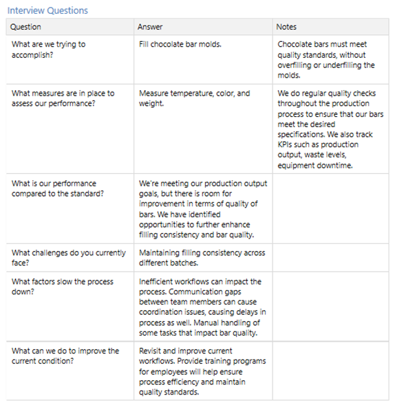 Después de su Gemba Walk, Josh revisa sus preguntas y hallazgos. Comenzando con su primera pregunta, "¿qué estamos tratando de lograr?" Josh entiende que su objetivo principal es producir barras de chocolate de calidad que cumplan con las especificaciones. También sabe que la mejora de la calidad a menudo brinda amplias oportunidades no sólo para ahorrar costos, sino también para ofrecer un mejor producto a los clientes.