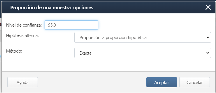 - Elija Estadísticas > Estadísticas básicas > 1 proporción.