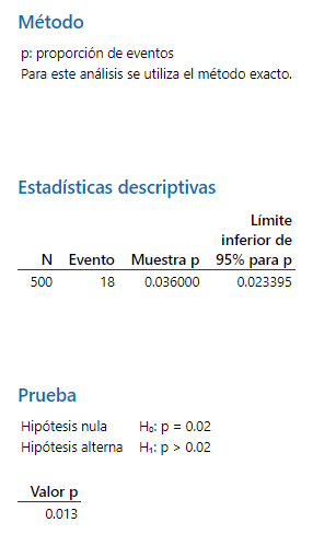 - Hipótesis nula (H0): La tasa de defectos es igual o menor al 2% (p ≤ 0,02)