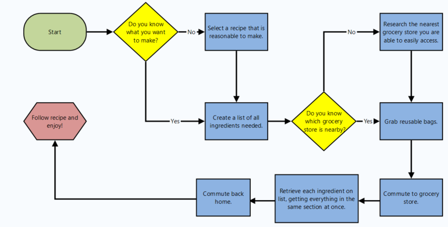 Mi primer mapa de procesos describió la rutina necesaria para adquirir todos mis alimentos de una sola vez. Con opciones de transporte limitadas, necesitaba un enfoque estructurado. En lugar de ir aleatoriamente a la tienda y recoger ingredientes que podría o no usar, tracé metódicamente el proceso para que esta tarea fuera perfecta.