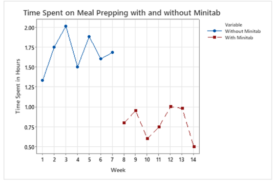 A continuación puede ver cuánto más eficiente es la preparación de comidas cuando comencé a planificar y visualizar mi proceso. Usando diagramas de líneas en Minitab antes y después de comenzar a planificar la preparación de mis comidas, puede ver el cambio en el tiempo que tomó preparar las comidas. Como puede ver en las estadísticas descriptivas que generó Minitab, me tomó en promedio 1 hora y 40 minutos preparar y cocinar mis comidas antes de planificarlas y optimizarlas. Después de usar Minitab para planificar mis procesos y ver dónde puedo reducir el tiempo, ahora me lleva en promedio solo 47 minutos realizar las mismas tareas.