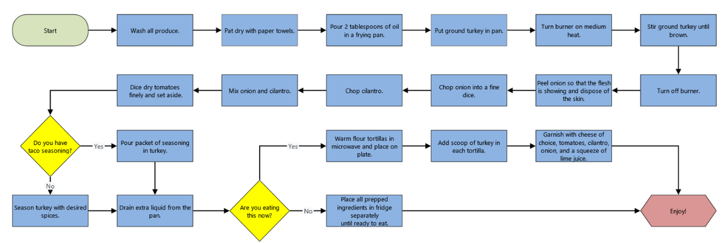 Sin embargo, con un mapa de procesos en Workspace, pude revisar cada una de mis recetas para tener los recursos para preparar mis comidas de la semana de manera eficiente. A continuación se muestra un mapa de proceso de una receta de tacos de pavo molido que preparé al comienzo de la semana y luego pude comer en mis días más ocupados.