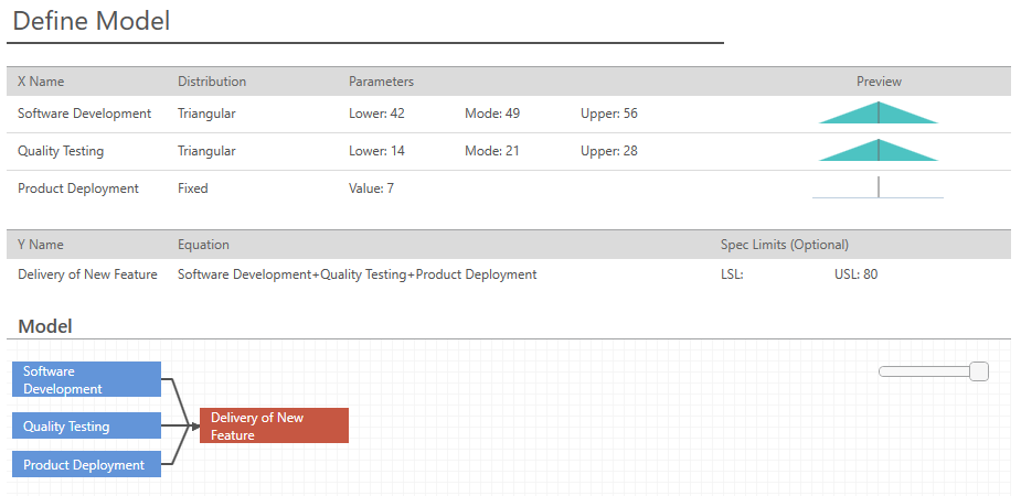 Como puede verse en el siguiente diagrama, se incluyó el dilema de este gerente de proyecto en Minitab Engage para predecir la duración del proyecto. Se ha entrado las tres fases del proyecto (en días) y una especificación superior de 80 días, que es cuando el jefe imaginario quiere presentarlo en la conferencia de usuarios.