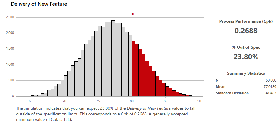 Armado con algunos análisis de datos, puedo tomar algunas decisiones informadas. Tal vez me siento cómodo con solo un ~76% de posibilidades de hacer feliz a mi jefe. O, más probablemente, necesito añadir recursos adicionales al proyecto para garantizar el éxito. Ser capaz de decirle a mi jefe mi nivel de confianza y por qué necesito reasignar o invertir para cumplir con su plazo de 80 días probablemente dará como resultado una conversación mucho más productiva antes del proyecto y mucha más comprensión al final del proyecto, en caso de que no se cumpla con la fecha límite.