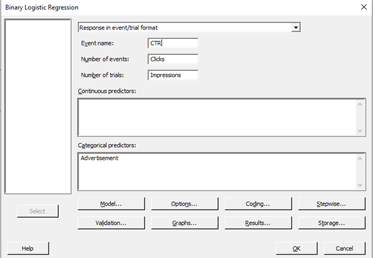 Al ir a Estadísticas > Regresión > Regresión logística binaria > Ajustar modelo logístico binario, Minitab presenta una ventana de diálogo para que seleccione “Respuesta en formato de evento/ensayo” y complete mis eventos (clics) y ensayos (impresiones). ¡También selecciono Publicidad como elemento que estoy probando y dejo que Minitab cree mi modelo!