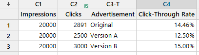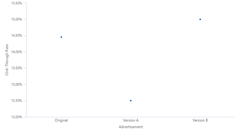 Imagine que un especialista en marketing ejecuta una campaña publicitaria periódica en las redes sociales para atraer visitantes a su sitio web. Deciden ejecutar una prueba A/B/C con diferentes versiones del anuncio para ver qué anuncio generará más clics. Apuntan a 20.000 impresiones para cada anuncio y realizan su prueba. Recopilan sus resultados y los grafican. Según el gráfico de valores individuales, está claro que la Versión A tuvo un peor desempeño que la Original y la Versión B. La pregunta sigue siendo: ¿son las diferencias estadísticamente significativas para alejarse del original?