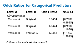 Ahora necesitamos profundizar un poco en las estadísticas (¡no mucho, solo un poco! Estás aquí para aprender algo, ¿no?). Mirando la tabla a continuación, vemos el Odds Ratio que compara las probabilidades de dos eventos, en nuestro caso haciendo clic en los diferentes anuncios. Minitab configura la comparación enumerando los niveles en 2 columnas, Nivel A y Nivel B. El nivel B es el nivel de referencia para el factor. Los índices de probabilidad superiores a 1 indican que el evento, en nuestro caso los clics, es más probable en el nivel A. Los índices de probabilidad inferiores a 1 indican que es menos probable que se produzca un clic en el nivel A.