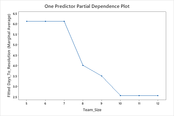 Afortunadamente, la herramienta de aprendizaje automático automatizado de Minitab también equipó al equipo con otro recurso valioso: los gráficos de dependencia parcial de un predictor. Dado que el equipo identificó el tamaño del equipo como el predictor más influyente, podrían dedicar más tiempo a analizar un gráfico de ese factor. Minitab produjo los siguientes resultados: