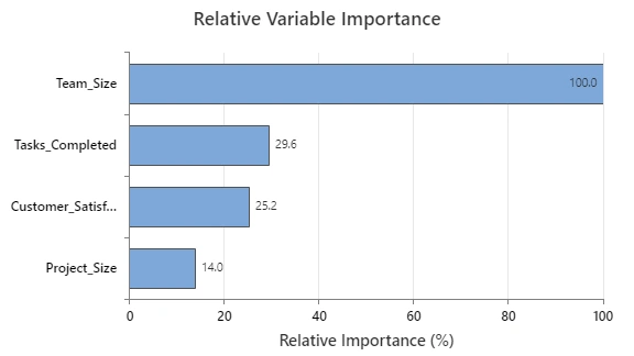 Tomaron sus datos y los ejecutaron a través del Módulo de analítica predictiva de Minitab para aclarar qué variables tuvieron el impacto más significativo en los resultados. Como no eran científicos de datos, utilizaron el aprendizaje automático automatizado, que está convenientemente ubicado dentro del módulo. Esta herramienta les ayudó a construir un modelo predictivo en cuestión de segundos y les permitió identificar el modelo más preciso a utilizar, identificando de manera efectiva los factores clave en el cierre de tickets. Sin la necesidad de mirar ecuaciones, la observación inicial del equipo se centró en el gráfico de importancia relativa de las variables, que se muestra aquí: