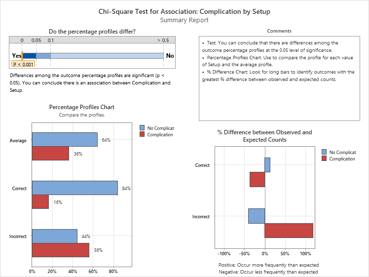 Con un valor de p inferior a 0,001, es seguro concluir que efectivamente hubo una asociación entre la proporción de complicaciones y la configuración del quirófano. Si se observa la tabla de perfiles porcentuales, se verá que en promedio el 64% de los procedimientos no resultan en ningún tipo de complicación. Si nuestra hipótesis nula fuera incorrecta, esperaríamos que los gráficos de barras "correctos" e "incorrectos" siguieran el mismo patrón, pero claramente no es así. Proporcionalmente, las cirugías en las que la sala estaba correctamente configurada se asociaron con una proporción de complicaciones mucho menor.