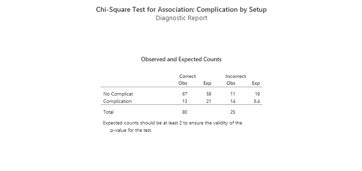 Introducimos nuestros datos de 105 cirugías en Minitab Statistical Software y realizamos una prueba de asociación de chi-cuadrado. Optamos por utilizar Chi-cuadrado en lugar de ANOVA ya que los resultados eran binarios "sí, hubo complicaciones" o "no, no hubo complicaciones"; los datos no eran continuos. Estos son los resultados que produjo Minitab: