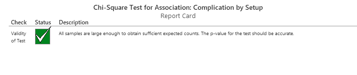 El informe de calificaciones confirma que este análisis fue efectivamente válido y puede usarse con confianza para demostrar una asociación, ya que todas las muestras fueron lo suficientemente grandes como para obtener suficientes recuentos esperados: un lenguaje fácil de entender tanto para estadísticos como para no estadísticos. Podemos concluir con confianza que nuestro valor p es exacto.
