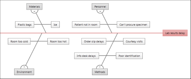 Los diagramas de espina de pescado, o diagramas de causa y efecto, ayudan a generar ideas sobre las posibles causas de un problema y a ver las relaciones entre las posibles causas. La espina de pescado a continuación identifica las posibles causas del retraso en los resultados de laboratorio: