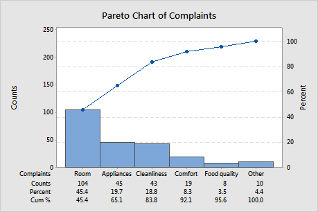 Los diagramas de Pareto pueden ayudar a priorizar los problemas de calidad y separar los "pocos problemas vitales" de los "muchos triviales" al trazar las frecuencias y los porcentajes correspondientes de una variable categórica, lo que le muestra dónde concentrar los esfuerzos y recursos.