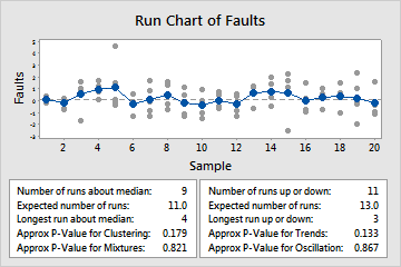 El gráfico de ejecución de Minitab traza las observaciones individuales en el orden en que fueron recopiladas y traza una línea de referencia horizontal en la mediana. Minitab también realiza dos pruebas que brindan información sobre la variación no aleatoria debida a tendencias, oscilaciones, mezclas y agrupaciones: patrones que sugieren que la variación observada se debe a causas especiales.