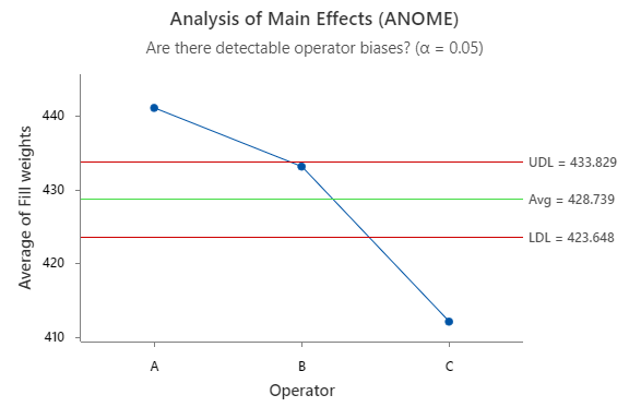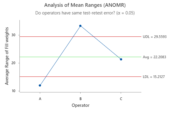 El estudio EMP también incluye información que puede utilizarse para decidir cuándo priorizar las mejoras en el sistema de medición. El Análisis de Rangos Medios (ANOMR) y el Análisis de Efectos Principales (ANOME) muestran dónde la reproducibilidad es baja en relación con la variación del proceso. En este ANOMR, el operador B es menos consistente que los otros dos operadores. Mejorar la coherencia para el operador B mejorará el sistema de medición.