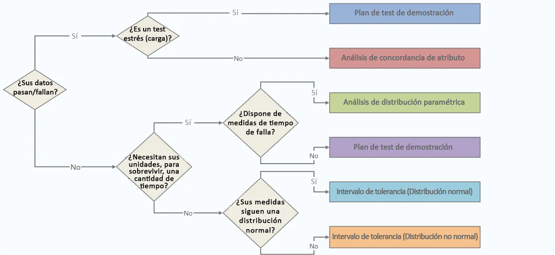 El siguiente diagrama de flujo lo guiará hacia herramientas comunes en Minitab Statistical Software para demostrar 95/99 u otro objetivo de confianza y confiabilidad: