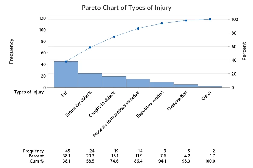 Surefoot experimentó más lesiones que la norma en empresas similares. Los gráficos de Pareto, un tipo de visualización que encontrará en Minitab Statistical Software, destacan por resaltar los factores que más contribuyen a un problema en particular. El uso de un diagrama de Pareto reveló los tipos de lesiones que ocurren con mayor frecuencia en los lugares de trabajo de Surefoot: