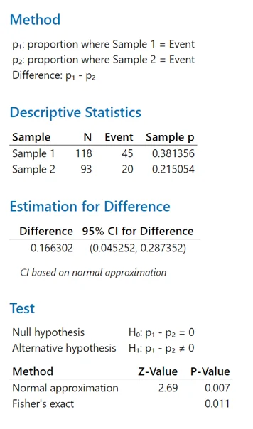 Después de implementar estos cambios, Surefoot quería evaluar si había mejorado la seguridad contra caídas en sus sitios de construcción. Utilizando nuevamente Minitab Statistical Software, utilizaron los nuevos datos sobre lesiones del año y ejecutaron una prueba de dos proporciones. A través de este análisis, la proporción de caída de incidentes con respecto al total de incidentes del año anterior se compara con la nueva proporción de caída de incidentes con respecto al total de incidentes para ver si se produjo una diferencia estadísticamente significativa: