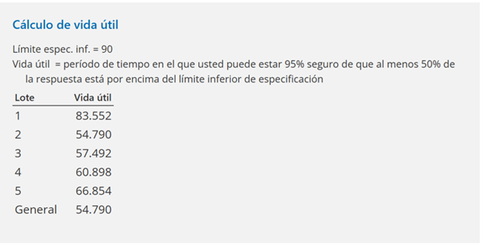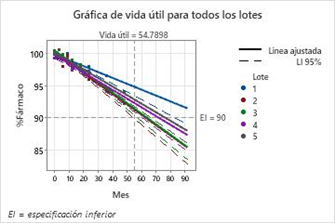 En este ejemplo se auditan 5 lotes piloto de un fármaco y se desea saber en qué momento las píldoras alcanzan 90% de la concentración prevista. La estrategia adoptada es tomar datos representativos y medir la respuesta a lo largo de un tiempo más reducido que la vida del producto. Con estos datos, Minitab calcula la vida útil, un lapso mucho mayor que el recogido en las pruebas experimentales y que es el que se espera que la respuesta permanezca dentro de las especificaciones.
