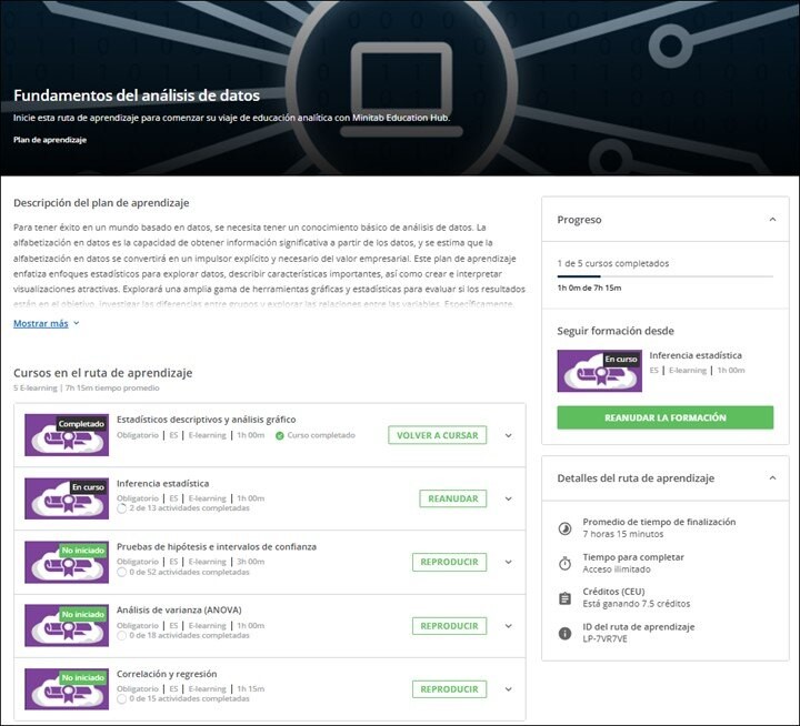 ¡Minitab se complace en anunciar una nueva imagen y experiencia con el estreno de un nuevo reproductor de cursos! El reproductor de cursos es el marco en el que se muestran las rutas de aprendizaje y los cursos de e-learning, así como los cursos dirigidos por instructores. Los siguientes son algunos de los principales cambios que notará.