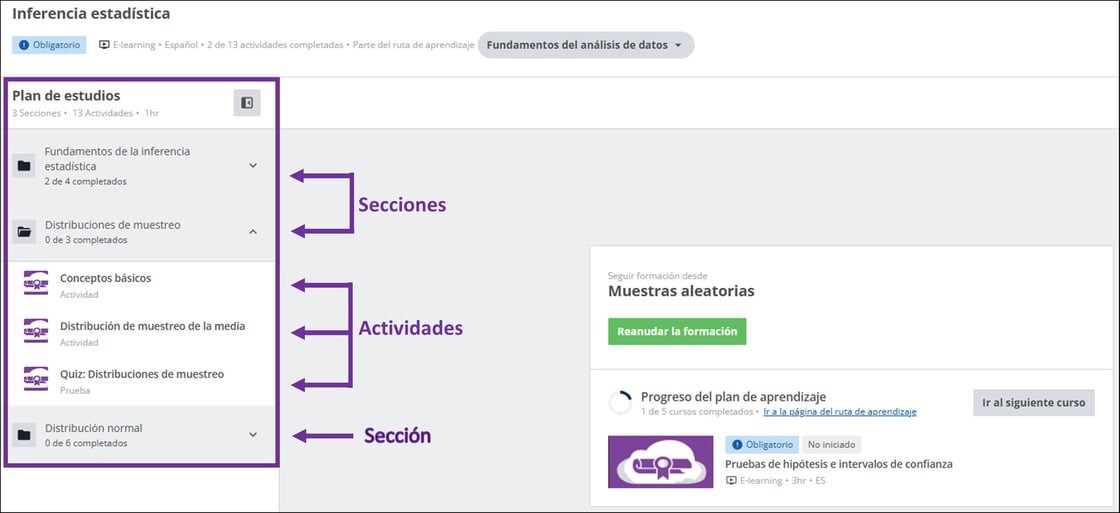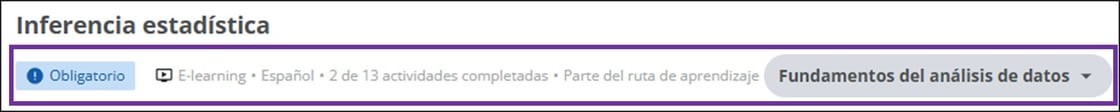- La barra de título ofrece una descripción general inmediata y completa en la que se muestra si el curso es obligatorio para obtener un certificado de finalización, el tipo de curso (e-learning o dirigido por instructor), el idioma del curso, la cantidad de actividades completadas, junto con el menú desplegable de la ruta de aprendizaje que le permite navegar rápidamente a otros cursos de la ruta.