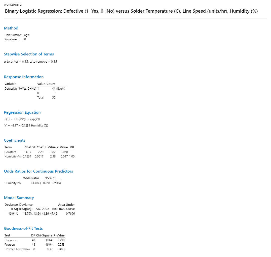 Luego, utilizamos el software estadístico Minitab y aplicamos la regresión logística binaria por pasos para determinar si alguno de estos factores tenía un impacto estadísticamente significativo en las tasas de defectos. Esto es lo que produjo Minitab: