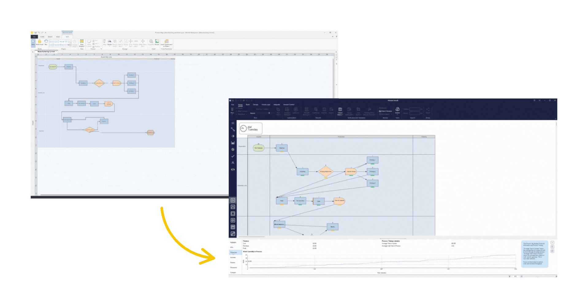 Desarrollamos específicamente la integración entre Minitab Workspace y Simul8 para abordar esta brecha crítica. Con un solo clic, sus mapas detallados de procesos de Workspace se convierten instantáneamente en simulaciones dinámicas y funcionales en Simul8, sin necesidad de desarrollo ni reelaboración adicional.