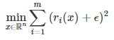 Considérese el siguiente problema sin contornos donde ϵ es algún ruido uniforme aleatorio en el interval [−ν,ν] y ri son los residuos de la función de test de Rosenbrock (m=n=2):