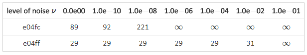 En la siguiente tabla presentamos el número de evaluaciones del modelo necesario para alcanzar un punto dentro de 10−5 de la solución real para varios niveles de ruido ν (la no convergencia se marca con ∞).