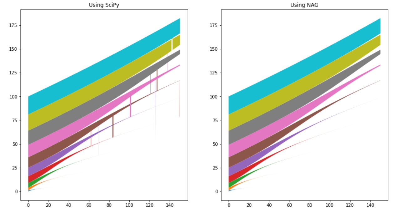 Calcular con precisión las funciones de Mathieu puede ser difícil y hay muchos documentos sobre el tema. Aquí hay una demostración, tomada de una pregunta de StackOverflow, que muestra cómo la implementación de SciPy de Python ocasionalmente tiene problemas. La implementación NAG calcula los resultados correctos como se muestra en la gráfica superior.