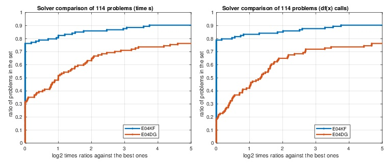 La siguiente figura 1, ofrece valores de referencia utilizando perfiles de rendimiento sobre un conjunto de problemas NLP CUTEst (Constrained and Unconstrained Testing) para los resolvedores e04kf y e04dg. Comparando los dos gráficos, se puede observar que el nuevo resolvedor es más eficiente en tiempo y en términos de llamadas del usuario: resuelve el 45% de los problemas más rápidamente (gráfico izquierdo) y el 60% de los problemas requiere menos evaluaciones del gradiente (gráfico derecho). Estos resultados muestran la clara ventaja de e04kf. Animamos claramente a los usuarios actuales de uncon_conjgrd_comp (e04dg) a actualizar.